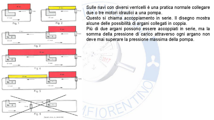 In basso a sinistra è presente la pompa che aspira l’olio attraverso un sistema filtrante. Tramite una elettrovalvola proporzionale a 3 posizioni 6 vie possiamo mettere l’argano a riposo posizionando quest’ultima nella posizione centrale. Da notare che il centro della valvola è di tipo chiuso per cui vi sarà una valvola di sovrapressione (non visibile nel disegno) che ricircolerà l’olio al serbatoio. Spostando il cassetto di questa elettrovalvola a destra o a sinistra faremo ruotare l’argano in un senso o nell’altro.